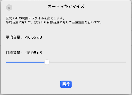 メニューの [書き出し] - [オートマキシマイズ] を選択すると、音量調整のダイアログが表示されます。
