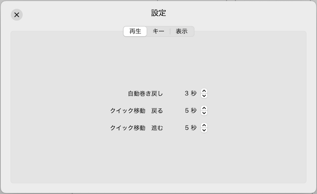 キー設定で「巻き戻し」「早送り」に設定されたキーを押したとき、指定した秒数分だけ「巻き戻し」「早送り」されます。